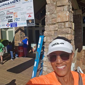 Caniece Haywood, Jerome Bradley, and Priscilla Blasingame of Above the Net set up post at Hole #4 where we challenged each participant to bounce a tennis ball on a racket ensuring that the ball bounced above their head more times than their teammates. The winner received a raffle ticket for a collection of gifts including a drone, over the ear headphones, a Thermacell mosquito repellent device, and a camo inspired baseball cap...all items donated by sponsors of the event.