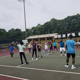 All of that was going on Saturday morning as new Above the Net Coach Guy Reddick and Assistant Coach Tyler Ladge put the juniors through the paces. They started the morning with the ladder and the cones...two tools for footwork training that are a must... and also quite intimidating! Yet the younger kids and the older kids all took it in stride and did their best to make it down/ across the ladder and through the cones without knocking them over!! But footwork was not the only area of focus this weekend. At one point all of the kids were lined up at the net to practice both forehand and backhand volleys and boy did they nail that drill! Finally, it was time to practice serves. They were tapping their backs with the racket and trying to make contact as they released the ball up. Serves is probably one of the toughest skills to master but you have to start somewhere and the kids were certainly trying on Saturday. At 12:00 when it was technically time for the clinic to end the little ones (was it Caroline? Zoe? Laila?) not sure...started asking about the Alligator Game. So we couldn't leave without playing it. They knew exactly what to do and had fun hitting that ball and catching the balls depending on what side of the net they were!! All in all, more skills were learned, fun was had, exercise was achieved! See ya next week!